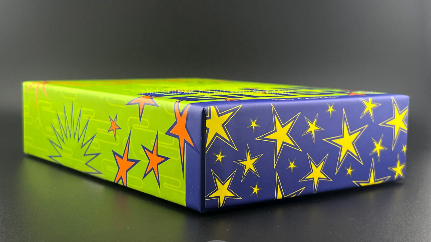 「ウノ キャンヴァス ビリーアイリッシュ デッキ」はビリー自身によりカラーやシンボル、数字が特徴のブロッシュを散りばめたビリー自身のデザインによるもの(公称パッケージサイズ:タテヨコ高さ、それぞれ17.78/ 12.70/ 4.13cm)。