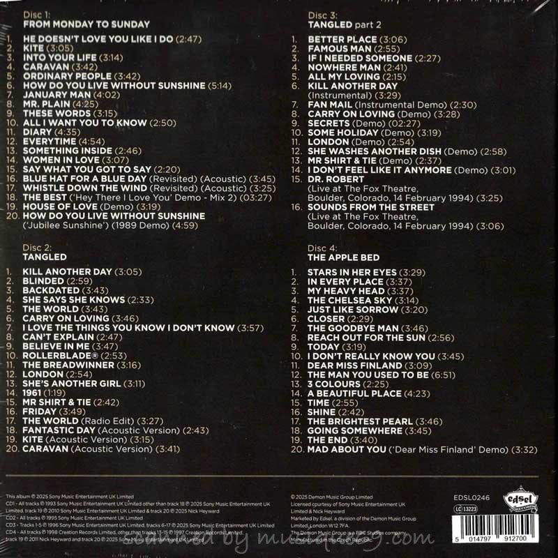 エピック&クリエイション在籍時のアルバム4枚「From Monday to Sunday」「Tangled」「The Apple Bed」全曲に加え、B面やボーナストラックなどのアルバム未収録曲を全22曲、デモやライヴなどの未発表録音を全15曲と追加収録。